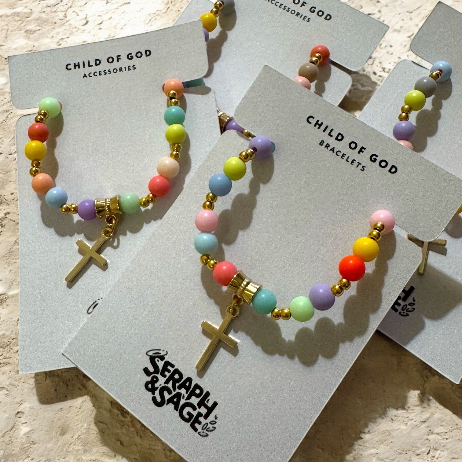 A beautiful and meaningful accessory for teens, this pastel multicolour “Child of God” bracelet is designed to be a daily reminder of identity, purpose, and faith. Featuring soft pastel beads paired with elegant gold accents and a hanging cross charm, it’s the perfect blend of style, spirituality, and subtle Christian elegance. Great for youth groups, church events, gifting, or everyday wear.