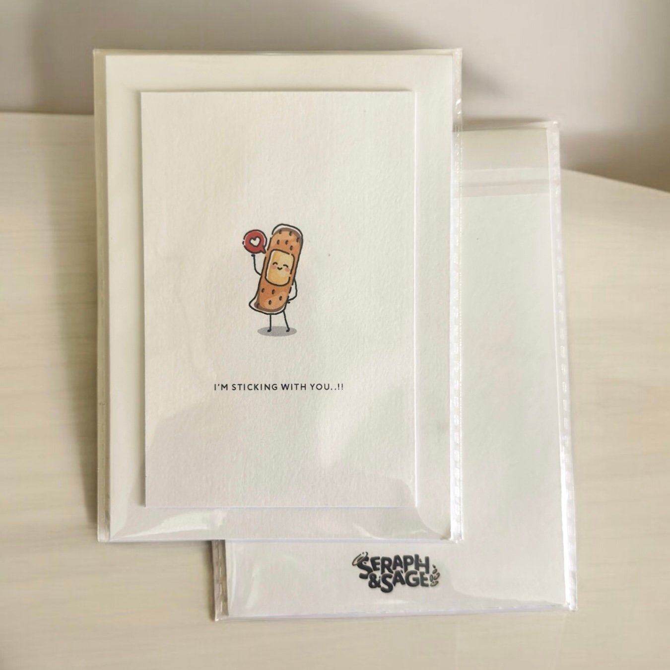 The “I’m Sticking With You” note card features an adorable pun illustration that’s perfect for letting someone know you care. Sweet, playful, and full of charm, this card is ideal for friends, partners, kids, teens, or anyone who loves a good pun.